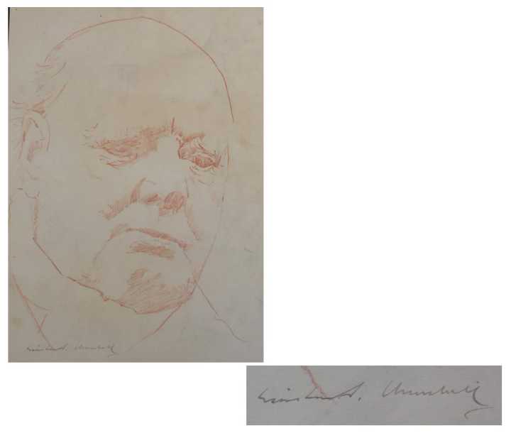This purports to be a drawing of Churchill signed by him, a not uncommon form of forgery in which the drawing itself is intended to distract attention from the signature, which in this case is certainly not genuine.