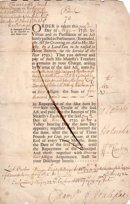 MARLBOROUGH, Sarah Churchill, Duchess of (1660-1744). Document Signed on the reverse as executor of her husband's will, partially printed and completed by hand, 1 page large folio (splits in the folds), 16 May 1732. An exchequer document ordering the repayment of £5000, a loan by Land-Tax. The document is also signed the other executors of the Duke's will, George Dodington (1691-1762, friend and financial backer of Frederick, Prince of Wales), George Oxenden (1694-1775, Whig politician), Francis, Earl of Godolphin (1678-1766, politician whose tutor was John Evelyn), John Hanbury (1664-1734, ironmaster) and William Clayton (1671-1752, politician). The linked image shows the signatures on the verso of the document. [No: 26143] The first image shows the printed side. The image links to a larger or more detailed version.
